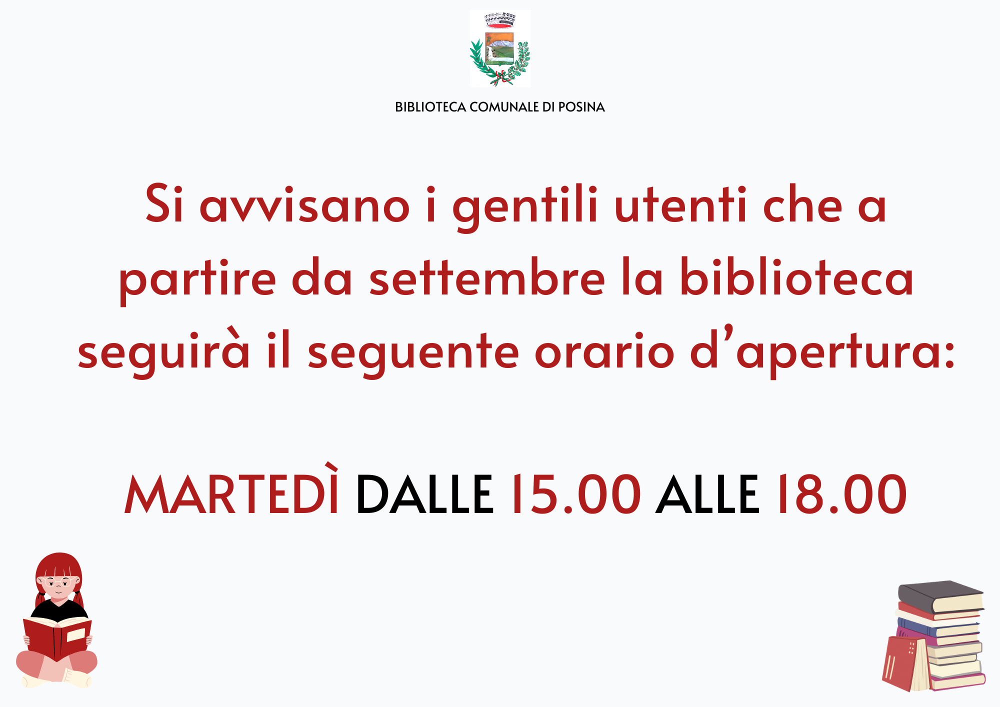 Descrizione Si avvisano gli utenti che la biblioteca da settembre avrà i seguenti orari di apertura:Martedì dalle ore 15.00 alle ore 18.00